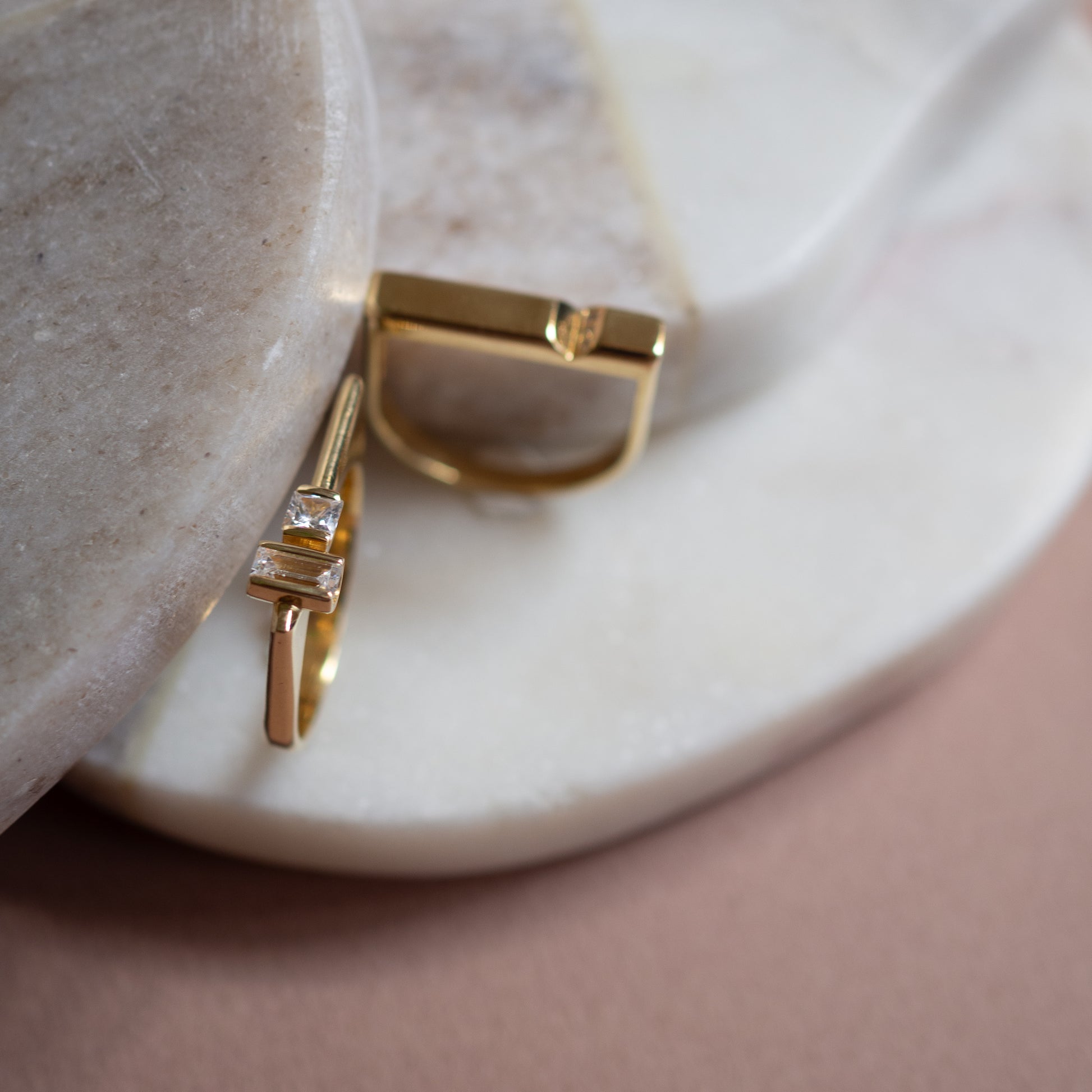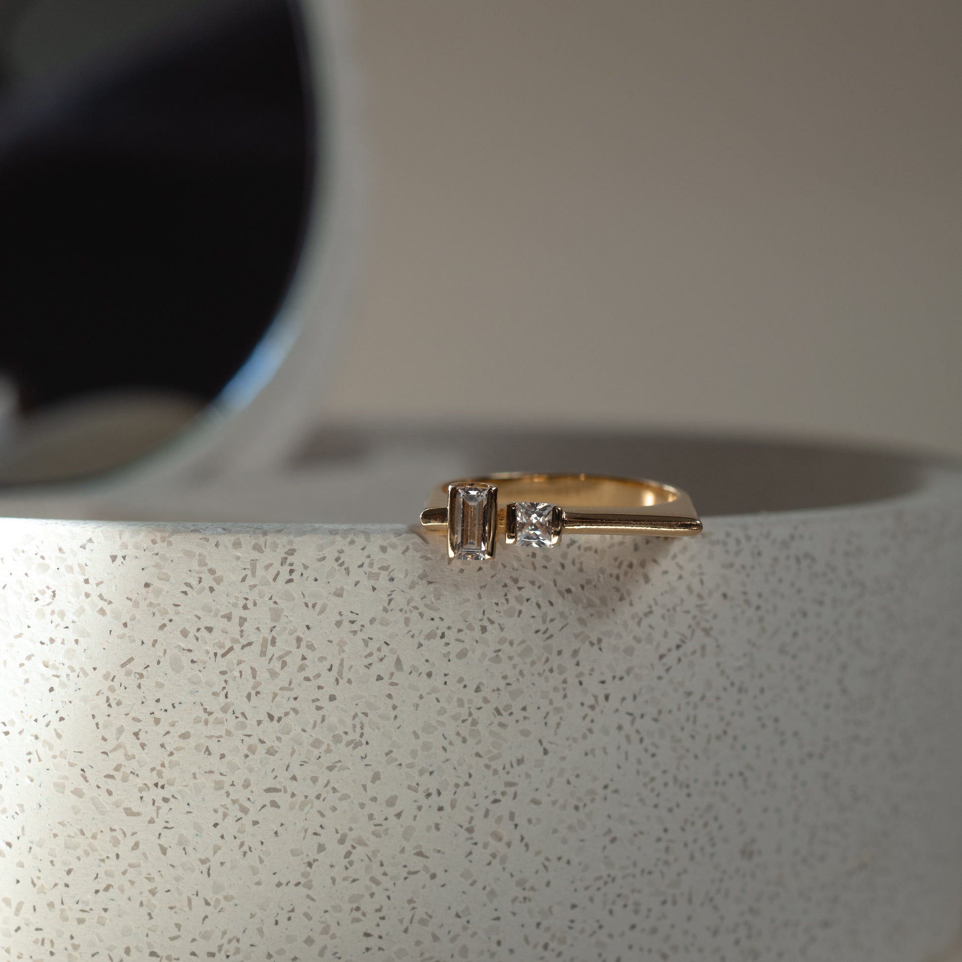 טבעת זהב 14k משובצת ביהלומים בחיתוך באגט ופרינסס, מרהיבה ביופייה. מושלמת כטבעת אירוסין מהפנטת שלא תרצי להפסיק להסתכל עליה.